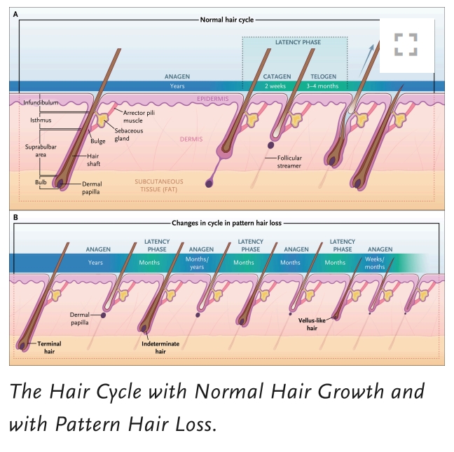 Hårtab hos både mænd og kvinder er karakteriseret ved en fremadskridende miniaturisering af hårsække, forkortelse af hårets vækstfase og forlængelse af hårets hvilefase så håret ikke længere vokser og regenererer normalt.
